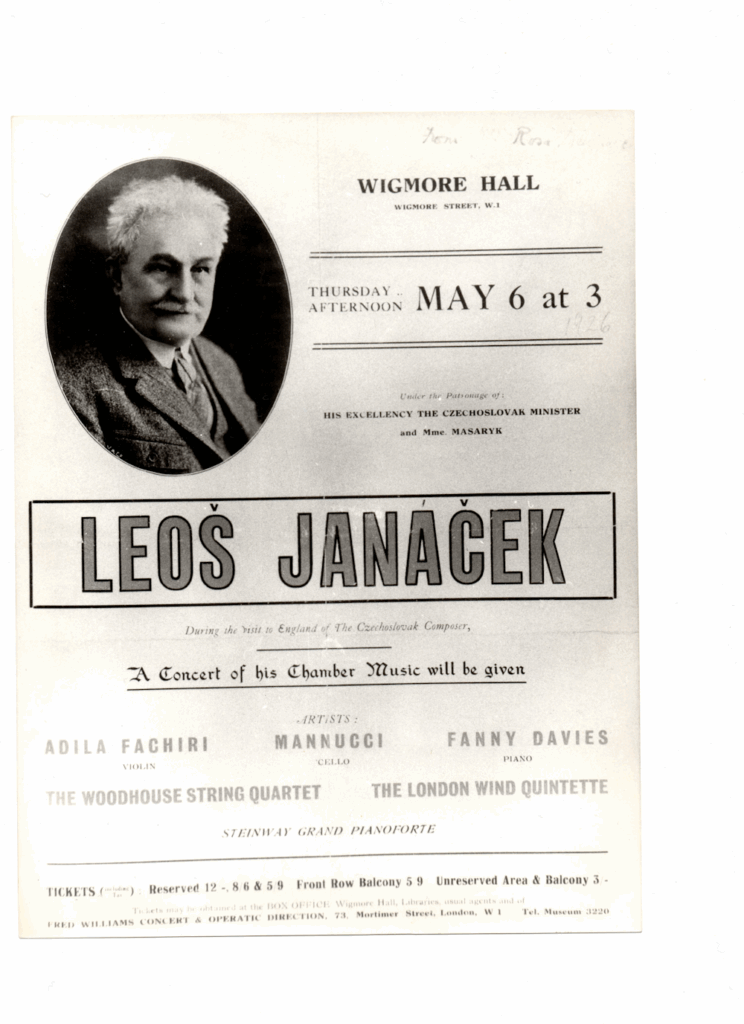 V pátek 10. února dirigoval Henry Wood vaši Sinfoniettu na koncertě určeném k živému rozhlasovému přenosu v Queen’s Hall. Moje Sinfonietta byla skvěle zahraná; trumpety a pozouny a tuby byly opravdu vynikající. Sir Henry, který je velmi potěšen originalitou a svěžestí této skladby, ji velmi pečlivě nastudoval. Já jsem byla velmi hrdá na to, že je věnována mně… Ale naši kritici se vyznačují směsí hlouposti a strachu. Na zkouškách se zdálo, že se jim vaše hudba velice líbí, ale pak, když o ní měli něco napsat, nikdo neměl odvahu vyjádřit svůj názor! Tihle pánové se bojí všeho nového! Ale přesto to bylo pro vás vítězství… počet hráčů potřebných pro žesťovou sekci bude nepochybně představovat překážku při hraní v provinciích, ale jsem si jistá, že ji Sir Henry zase uvede, až se naskytne nějaká příležitost. V každém případě hodně přispěla k tomu, že vaše sláva zde roste. Teď budu pracovat na uvedení Mše, jen co mi ji Universal Edition pošle. (13. února 1928).