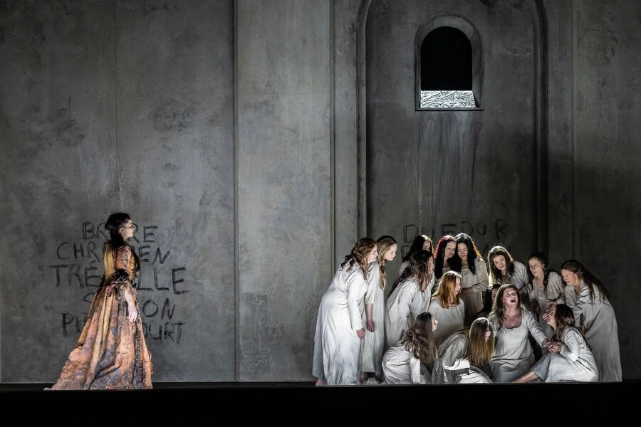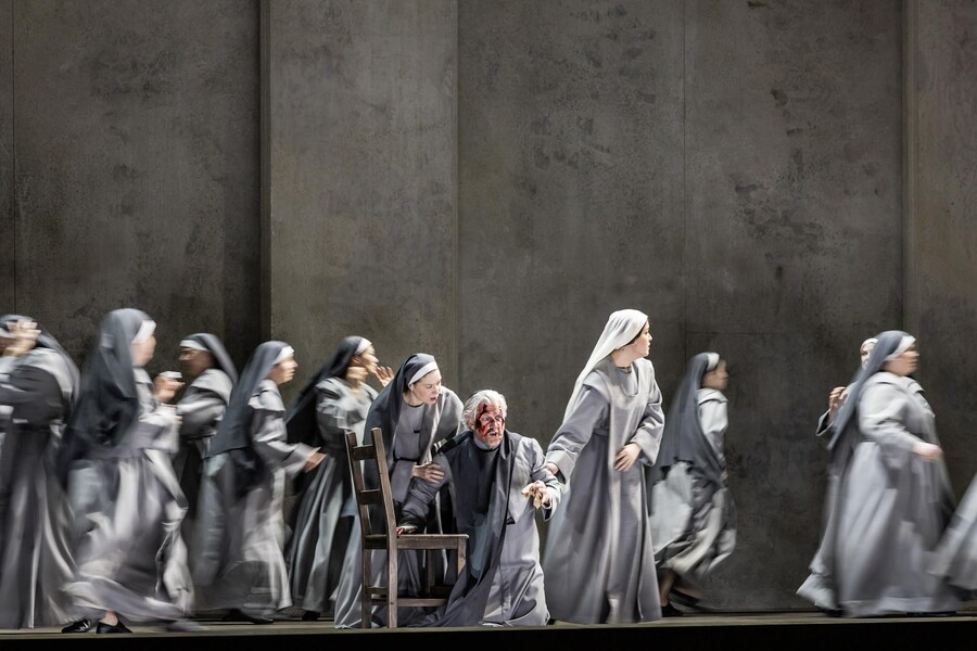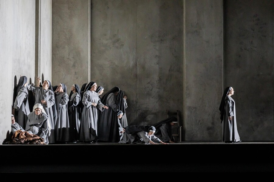Scénografie Bena Baura je uzavřeným nepříliš hlubokým šedým prostorem s několika potenciálními dveřmi a staví diváky v průběhu téměř celé inscenace před rovnou šedivou stěnu, se kterou po celý průběh opery spíše zápasí umná pestrobarevná hudební stavba díla vytvořená dirigentkou Marií Jacquot a jejími spolupracovníky. Poulencova hudba vychází z vnitřního obsahu zhudebněných slov a z divadelního čtení dramatických situací. Kostýmy odpovídají době francouzské revoluce. Pěvecké a herecké výkony zejména představitelky Blanche Marjukky TepponenEvelyn Herlitzius v důležité roli umírající Madame de Croissy byly pozoruhodné. Rozsah scénografické plochy se ani v závěrečné scéně popravy neproměnil. Při sugestívním zpěvu Salve regina, v němž postupně ubývá hlas po hlase, každá řeholnice vždy jen jemně sklonila hlavu, smazala své jméno napsané na zdi a odešla. Poulencovo hudební vyjádření s nečekaným skladatelovým svistem gilotiny této scéně jednoznačně dominovalo.
