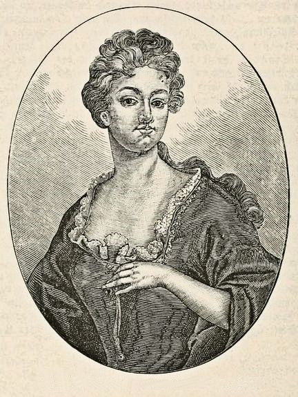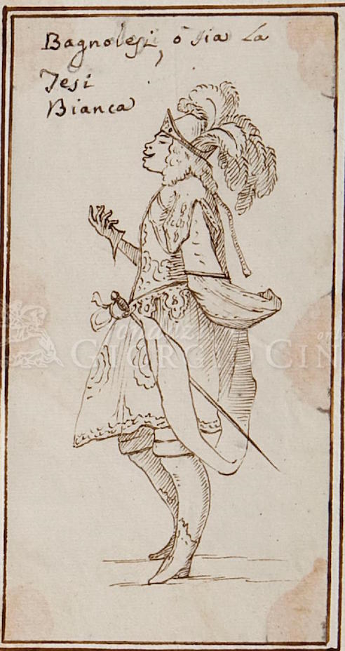Italská altistka Anna Bagnolesi v mužském kostýmu. Bagnolesi zpívala mužské i ženské role a na dobové karikatuře je označena jako „Bílá Tesiová“ (narážka na slavnou V. Tesi Tramontini).