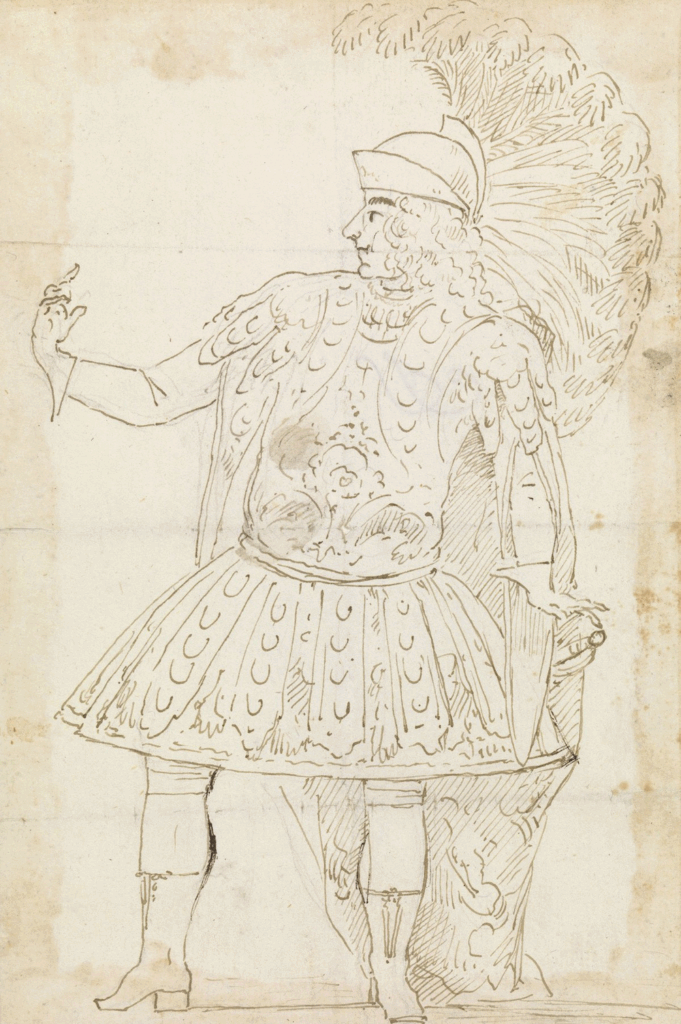 Italská kontraaltistka Diana Vico v mužském kostýmu, pravděpodobně jako Quintus Fabius v opeře Lucio Papiro dittatore v Teatro San Giovanni Grisostomo, Benátky, 1720. Karikatura Marco Ricci, c. 1720.
