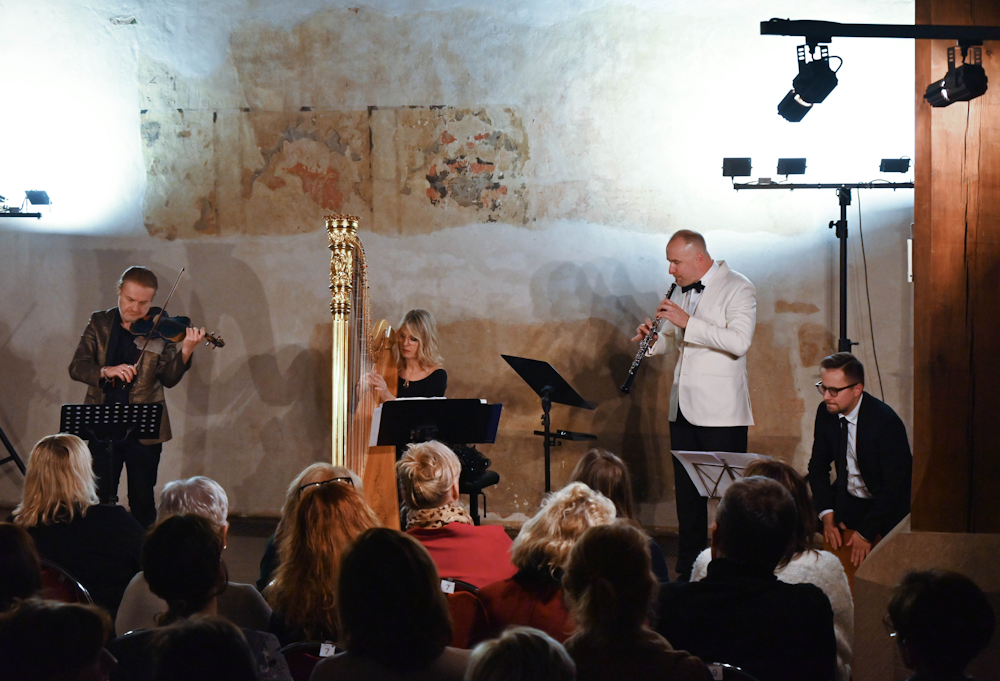 První část koncertu byla poté věnována francouzským skladatelům; nejprve v podání Pavla Šporcla a Kateřiny Englichové zazněla Fantazie op. 124 Camilla Saint-Saënse (1835 – 1921). Dílo z počátku 20. století bylo komponováno přímo pro housle a harfu a patří k nejpropracovanějším virtuózním skladbám zralého skladatele. V jejich podání se dostalo romantickému dílu nádherného vyznění, v němž na harfový zasněný úvod navázala nádherná kantiléna houslí a romantická virtuozita dostala v mistrných rukou náležité detailní prvky, prodchnuté emocemi a vnitřní krásou. Plnokrevná souhra spojila barvy houslí a harfy do krásné palety, precizní a zjemnělé pečlivou dynamikou. Harfové akordy provázející houslové sólo v sytém, odevzdaností naplněném souzvuku vykouzlily působivou atmosféru něžné krásy. V další Saint-Saënsově skladbě, známé La cygne (Labuť), uváděnou v nejrůznějších úpravách, se blýsklo již celé trio sólistů a poddalo se cituplné a jímavé interpretaci jemné melancholické melodie, kterou skladatel vykreslil pomíjivou povahu krásy. Tři virtuózové zahráli skladbu jakoby jedním dechem, houslové sólo provázela harfa, přidal se hoboj a rozezpívané trio posluchače nadchlo. Třetí skladbou byla Deux interludes (Dvě interludia) Jacquese Iberta (1890 – 1962) pro housle, harfu a hoboj. Kompozici ze čtyřicátých let uchopilo trio v romantickém duchu, z něhož byly patrné modernější, méně romantické, ale překrásně klenuté melodické linky, jak v prvním volném, tak i v živějším druhém Interludiu hezky probarvené dynamikou a perfektní technikou. Dramatičtější i lyričtější pasáže byly podány s energií, stylově odstíněné, harfová arpeggia spolehlivě provázející melodické linky hoboje a houslí až do forte a zpět do ztichlých sekvencí. Pečlivě vygradovaný závěr, zrychlený a působivý, byl uzavřen ráznou tečkou, aby se kráse melodie dostalo náležitého vyznění.