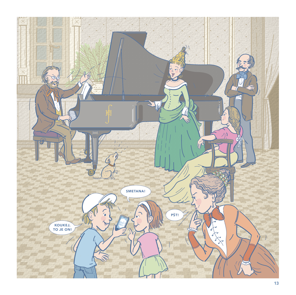 A pokračujme: představme si sebe sama ve věku sedmi let. Četli jsme jak literaturu pro tento věk, tak jsme prohlíželi knihy pro starší čtenáře a v nich hltali obrázky, jejich popisky atd. Já jsem si dle obrázků Verneův Tajuplný ostrov, který můj starší bratr četl, doslova vybájil a později jsem si tuto představu korigoval na základě přečtení několika set stran. Se Smetanou je to podobné: nejmladší čtenář začne obrázky, případně komentáři obrázků. Ilustrátorka Lenka Jasanská – soudě dle první ohlasů – odvedla skvělou práci: „Bedřich“ z knihy vystupuje jako člověk z masa a kostí, jako sympatický kamarád se smyslem pro humor. Když se takto pozitivně napoprvé „zapíše“, tak vznikne předpoklad k tomu, aby se dítě – úměrně s věkem – ke knize vracelo a postupně si ji osvojilo celou. Pravda, starší a dospělý čtenář to má lehčí, byť často říkám: „Nechtějte knihu přečíst za víkend, musí se dávkovat.“