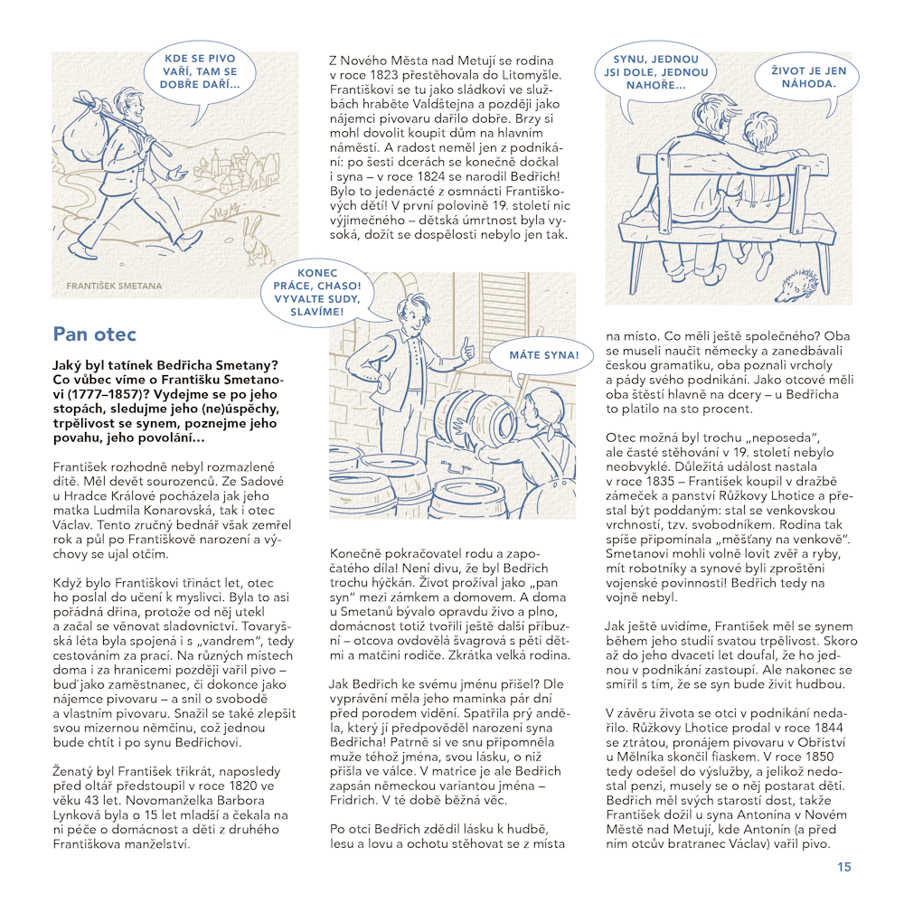 Děkuji za tu charakteristiku. K té více vrstevnatosti a širší čtenářské obci jsme došli jako autorský tým tak nějak intuitivně, prostě si lidsky rozumíme. A i kdybych se snažil sebevíce, nezapřu v sobě kantorské geny, až obrozeneckou potřebu šířit určitou osvětu. Snažil jsem se s velkou pokorou si představit někoho, kdo si to zaslouží. Byť je Bedřich Smetana pojem a fenomén, tak jen z určité perspektivy a zaslouží si pozornost typu, s kterou jsme přišli my. Od čtenářů mé knihy často slýchám: „Člověče, až teď začínám chápat, kdo to byl, co chtěl, jak žil, tu Mou vlast slyším jinak.“ A tehdy mám opravdu pocit určité satisfakce. Ukazuje se, že nejen pro mladší generaci jsou skladatelé vážné hudby ti „nudní, staří, vážní, přísní pánové na obrázcích v učebně hudební nauky“. Proti tomuto zjednodušení (které děti a mládež vidí jako první a dospělí si nesou v sobě) je třeba něco dělat.